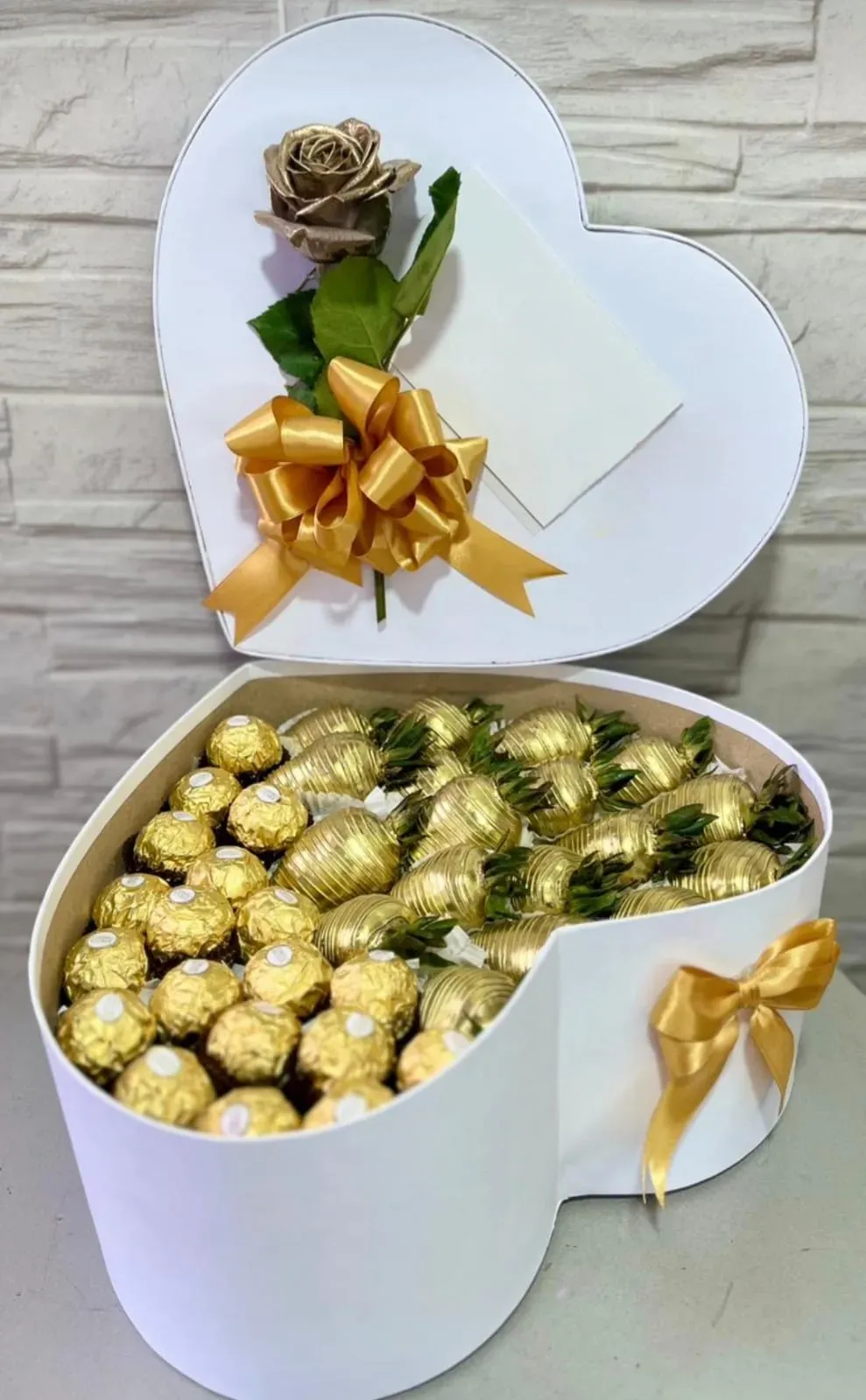 Un impactante corazón conformado de 20 fesas cubiertas con chocolate, 20 ferreros rocher, caja con adicional de rosa y tarjeta personalizada.