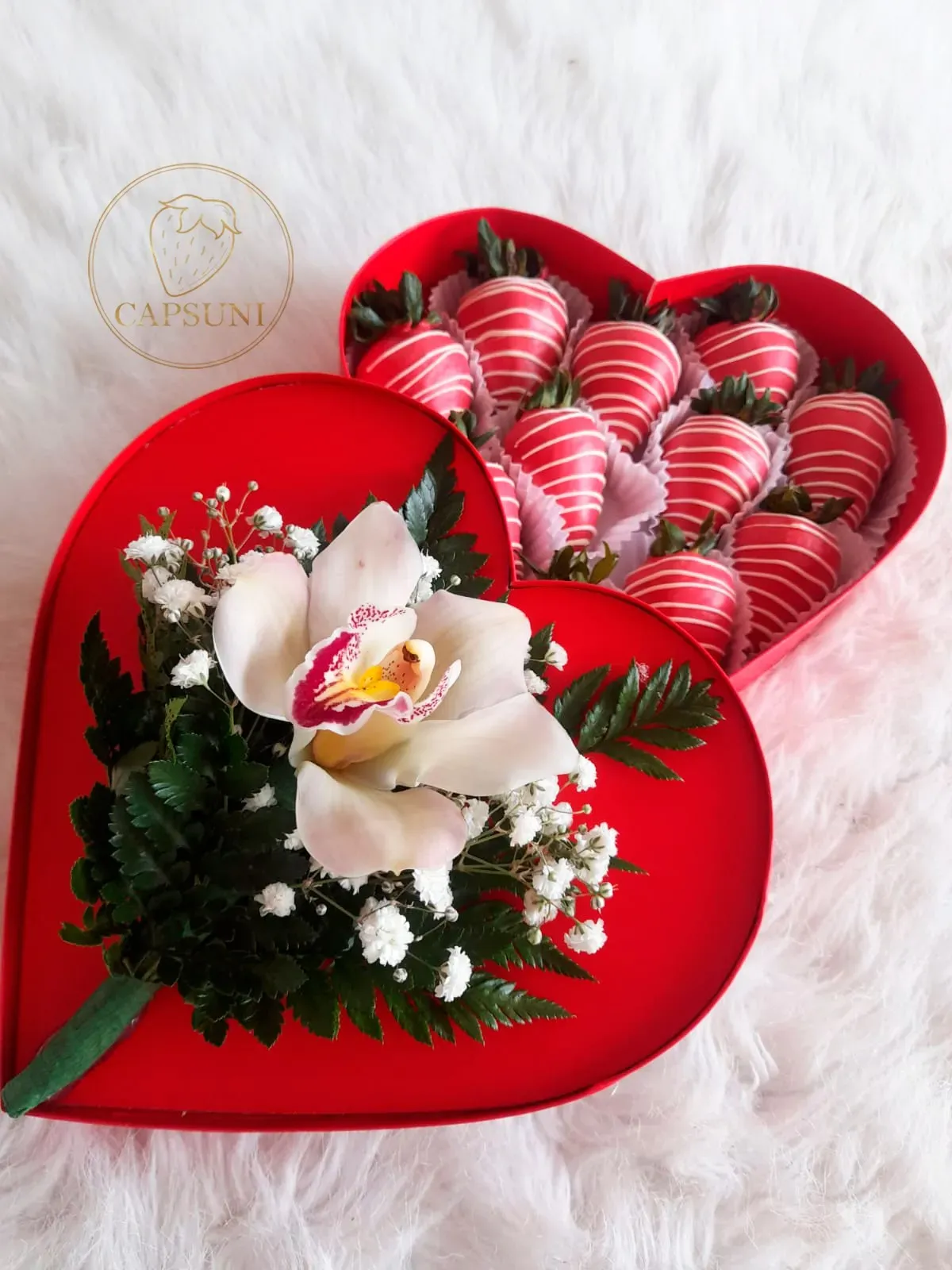 11 o 12 fresas cubiertas con chocolate, 1 bella y delicada orquídea, gypsophila, helecho cuero, caja decorada y tarjeta personalizada.